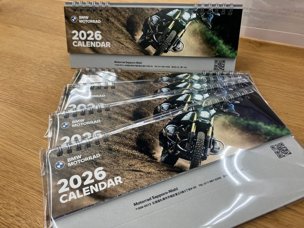 お出かけして店に戻ると届いておりました! 2026カレンダー!試乗プレゼントですが、もう試乗はできない気候なので、札幌西では早い者勝ちです! 数に限りがありますのでお早めに取りに来てくださいね。