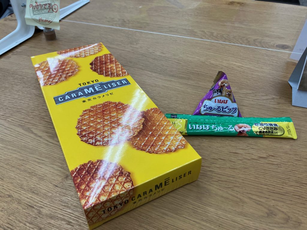お土産とうちのお犬様のおやつをいただきました! いつもお気遣いありがとうございます。 お犬様のおかげで日々頑張っているつもりなので非常に嬉しいです(笑) 普段はカリカリフードオンリーなので・・ちゅ~る、気が狂ったように喜びます(笑)