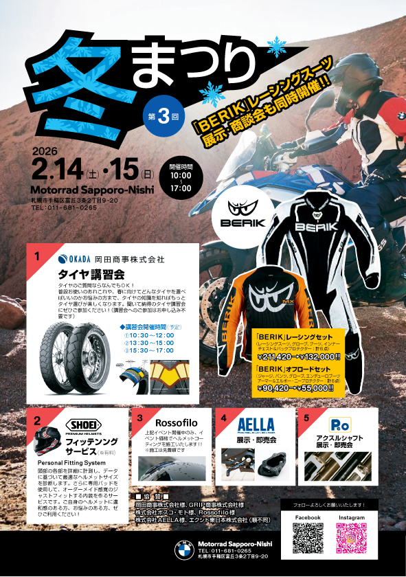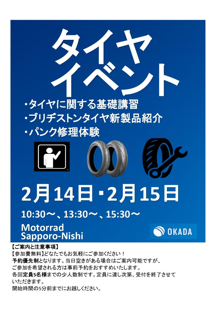 今回は3回に時間を区切ってタイヤのいろいろなお話をしてくれます!Motorrad Sapporo-Nishiにはブロックのヘビーユーザー様もかなり多いのでラジアルとバイアスのお話も盛り込んでいただきます。 ふわっとですが参加ご予約をいただけると嬉しいそうです。ご協力お願い申し上げます。