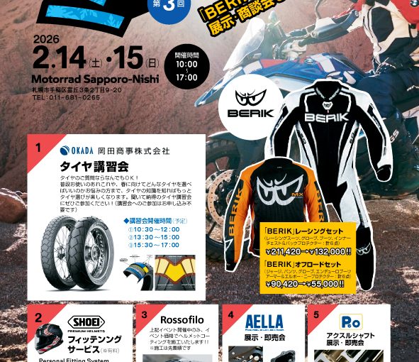 今回は3回に時間を区切ってタイヤのいろいろなお話をしてくれます!Motorrad Sapporo-Nishiにはブロックのヘビーユーザー様もかなり多いのでラジアルとバイアスのお話も盛り込んでいただきます。 ふわっとですが参加ご予約をいただけると嬉しいそうです。ご協力お願い申し上げます。