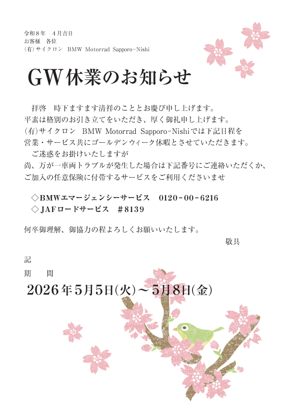 まずは、GWのお休みのご案内です。 5/5~5/8をMotorrad Sapporo-Nishiではお休みを取らせていただきます。 ご出庫やメンテナンスはお早目のご連絡をお願いいたします。工場もかなりK見合ってまいりましたので、ご希望に添えないケースも発生いたします。 何卒、ご理解ご協力の程よろしくお願い申し上げます。